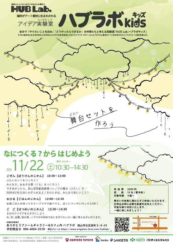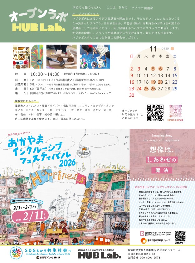 ハブラボは「なにつくる?」を合言葉に企業廃材と 自由な発想でアートを楽しむ、子どもたちのアイデア 実験室です。障がい・年齢・性別を超えたボーダーレ スなアトリエとして2020年7月にオープンしました。 障がいや難病を持つ人たちの就労の場でもある「あ りがとうファーム」で働くメンバーが中心となって講