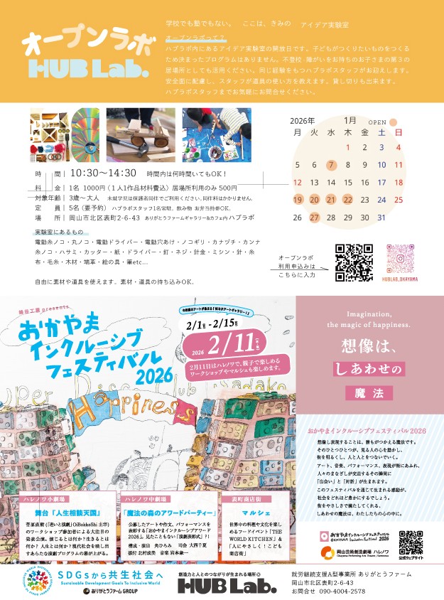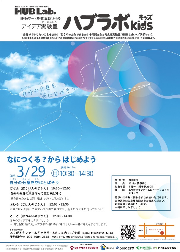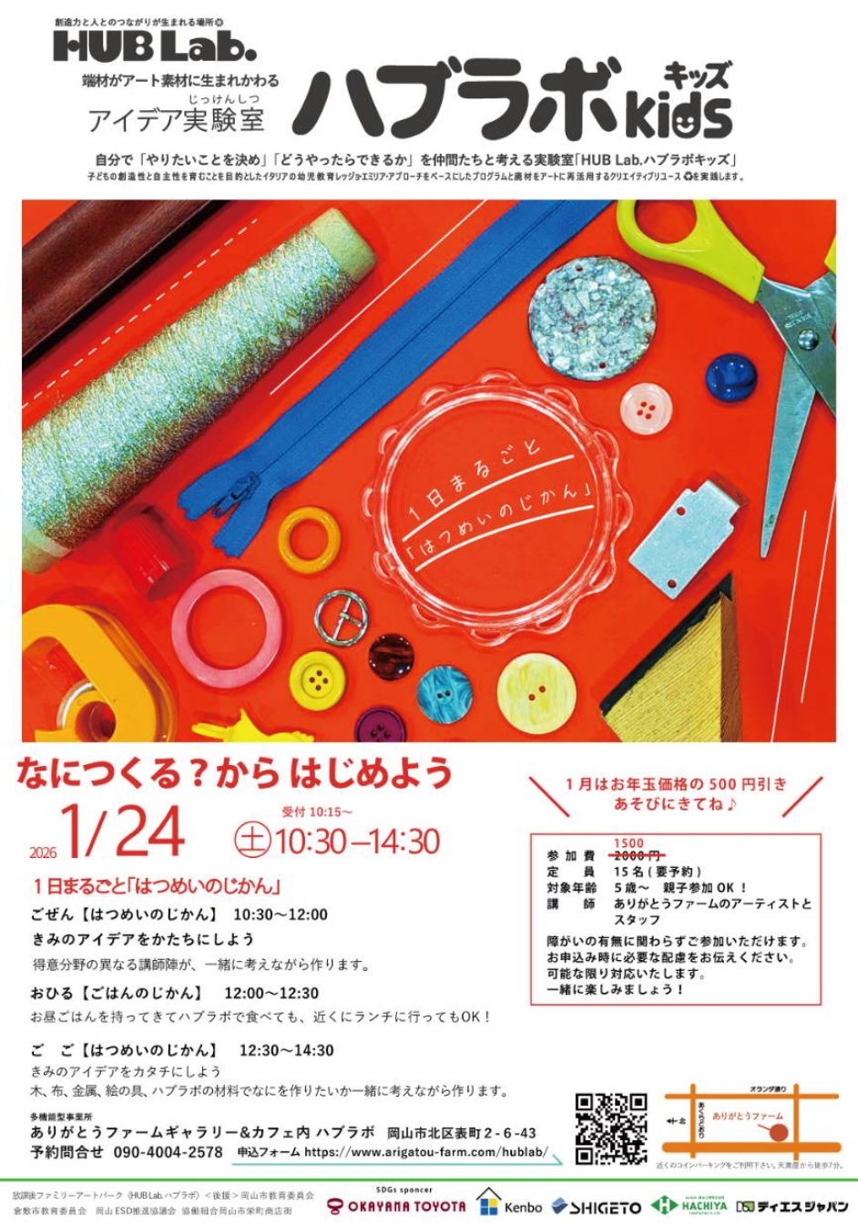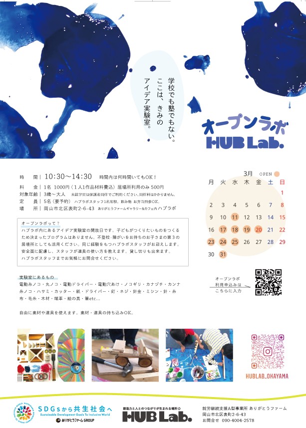 ハブラボは「なにつくる?」を合言葉に企業廃材と 自由な発想でアートを楽しむ、子どもたちのアイデア 実験室です。障がい・年齢・性別を超えたボーダーレ スなアトリエとして2020年7月にオープンしました。 障がいや難病を持つ人たちの就労の場でもある「あ りがとうファーム」で働くメンバーが中心となって講